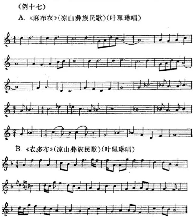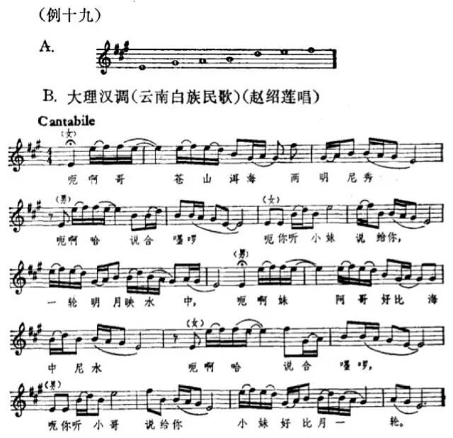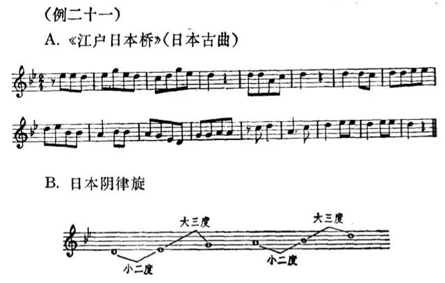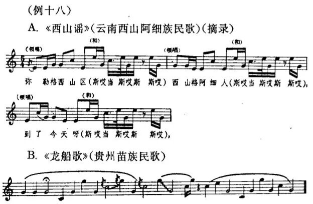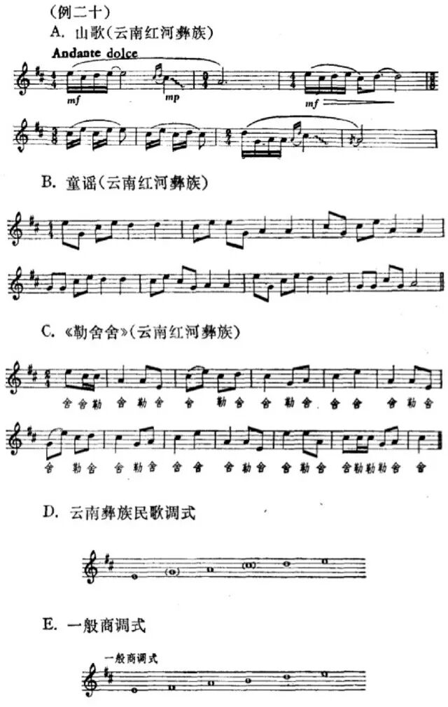 中国音阶及民族调式问题(下) (接上篇) 10.贵州凉山彝族的民歌,不但用非五声音阶,而且不断转调。如下例A.大致可以算作从C大调开始,转到F大调又转到c小调,然后又转到F大调,曲调进行类似西洋风格。 11.云南也是个多民族的省,在不同民族的音乐风格中所形成的调式的差异也是很大的。例如西山阿细族用最简单的大调主三和弦来构成他们的民歌旋律,贵州的苗族也运用这同样的三个音,可是风格完全不同。 13.云南彝族散布很广,音乐风格差别很大,下面举的几个红河地区彝族民歌的例可以看出它的调式类似商调式或多利亚调式(Dorian Mode),而与一般五声商调式不相同。如下面D与E两例,用小三度音G代替一般商调式的大二度音升F,用大六度音升C代替一般商调式的纯五度音B,因而在调式中形成升C到D的半音,G到升C的增四度音程。从下例三个曲调进行中,可以看出这两个音程用得很多,已成为该调式风格的特点。 一般人的概念,总认为流行在亚洲各地的五声音阶都是象钢琴黑键那样排列法的五声音阶,其实也有虽然是五声却与一般五声音阶不相同的调式。例如第十四例的湖南花鼓,第二十例的云南彝族民歌,其调式都与一般五声音阶不相同。日本也有五声音阶,可是日本的五声“阴律旋”调式与一般五声音阶也大不相同。下面是一首日本民歌的实例: 从上例曲调与其音阶的排列中,可以看出它与一般五声音阶迥然不同,它有两个半音与两个大三度。假如与第十三例B.湖南花鼓调式比较的话,在同一个D1到D2的八度中,音阶的排列法不相同。日本阴律旋在主音D1上有个小二度音降E与纯五度音A,这是花鼓调式所没有的。而花鼓调式有个大三度音升F与大七度音升C,这又是阴律旋所没有的。这两个都是五声音阶,可是都与一般五声音阶不相同。 应该承认上面所举的这些例子是很不全面的。但仅从第一例到第二十例中,已经可以看出中国民间存在的音阶与调式很复杂。我想大致可以分为如下几类: A.各种单纯的音列,如第十一例《新化山歌》,第十二例醴陵的《思情鬼歌》,第十八例《西山谣》《龙船歌》 B.一般的五声音阶。 C.虽然是五声音阶,与一般的五声音阶迥然不同,如第十四、第二十例(日本的阴律旋也属于这一类)。 D.六声音阶,如第四例陕北调式,十九例云南大理汉调等。 E.各种七声音阶的调式,如第二例《杏花天影》,第七例的山西梆子《拣柴》和山西民歌《苦伶仃》,第九例的秦腔,第十例的河南曲子,第十七例的凉山彝族民歌以及新疆各族民歌等。 我想以上这些例子足够说明中国调式的多样性了。在人类文化发展的历史过程中,作为音乐艺术重要因素之一的音阶或调式,是随着人类文化的发展而发展的。原始人类最初的歌声也许仅仅是同一音的节奏性的反复,然后才是两个音、三个音一直发展到现在一般运用的七声音阶及十二个半音以及各种不相同的调式。这段历史不知道经过了多少年代。中国文化由于长期处在独立发展的状态中,因而形成自己独特的体系,但是音阶发展的过程,我想应该与别国大致相同的。在中国古代是不是除了五声音阶以外,再没有别的音阶体系存在呢?我看谁也不能这样肯定。因为我们无法证明散布在全国各地的各种非五声音阶与我们古代的祖先毫无关系。两千年以前的一本关于中国音乐社会学的书《乐记》中,把“宫、商、角、徵、羽”,象征封建社会的秩序,所谓“君、臣、民、事、物”,把以五声音阶所构成的所谓庙堂之乐,作为统治人民,歌颂封建秩序的工具,把当时民间所存在的音乐称为“郑卫之音”,而一概加以否定。尽管如此,当时的诸侯之一的魏文侯还是说,听“郑卫之音”不感到疲倦,而听这种“古乐”时就要打瞌睡。根据记载,这时候早已有了变宫、变徽音及十二律的存在,而当时郑卫所在地的河南、河北两省,民间音乐中至今仍旧有七声音阶的因素存在。很可能这种所谓“郑卫之音”有些不是五声音阶的。 任何民间调式的形成都不可能是短期间的,必须经过长期历史的演变过程。因之我们应该可以肯定,中国过去与现在的民间都存在非五声音阶。这些非五声音阶的形成,有其不相同的过程,一种是基本上以一般五声音阶为骨架,加上变宫、变徵等音,这些音有时有转调的意义,有时仅作为装饰音用。第二种,由于增加了新的音而脱离五声体系成为其他的音阶。第三种,因为中国地方大,民族复杂,人民的经济生活、语言、风俗、地理及气候条件的不相同而形成不同的民族音调。这些音调,一开始就不是一般五声音阶的体系。第四种,也有象前面所说的外来的音阶,不过由于中国人民的生活习惯与不同的语言体系等等原因,在音乐风格上已起了根本的变化。 应该承认,文化交流是历史上客观存在的事实。人民虽然喜爱自己民族的文化,但也并不拒绝外来的文化;并且往往根据自己的喜爱来修改、溶化外来的文化,因而使自己的文化得到进一步的发展。中国文化虽然长期处在独立发展的状态中,但也并不是与外来文化毫无关系。事实上,中国音乐在历史上曾经受过外来的影响,同时也影响过外国。就中国民间现存复杂的调式来看,显然与其他国家的民族是有联系的。但是一般情况总是先有民族风格的音调,然后才形成民族的调式。因之,外来的音阶也必然因为音调的改变而有所改变,形成各自不同的调式。同时即或调式没有改变,但