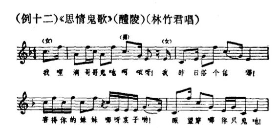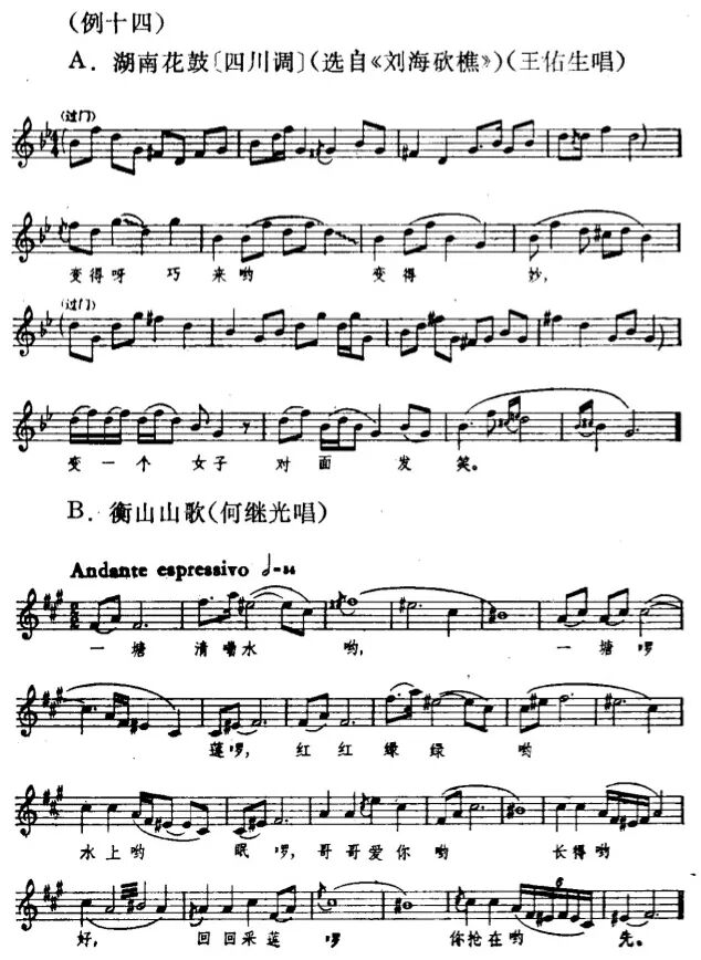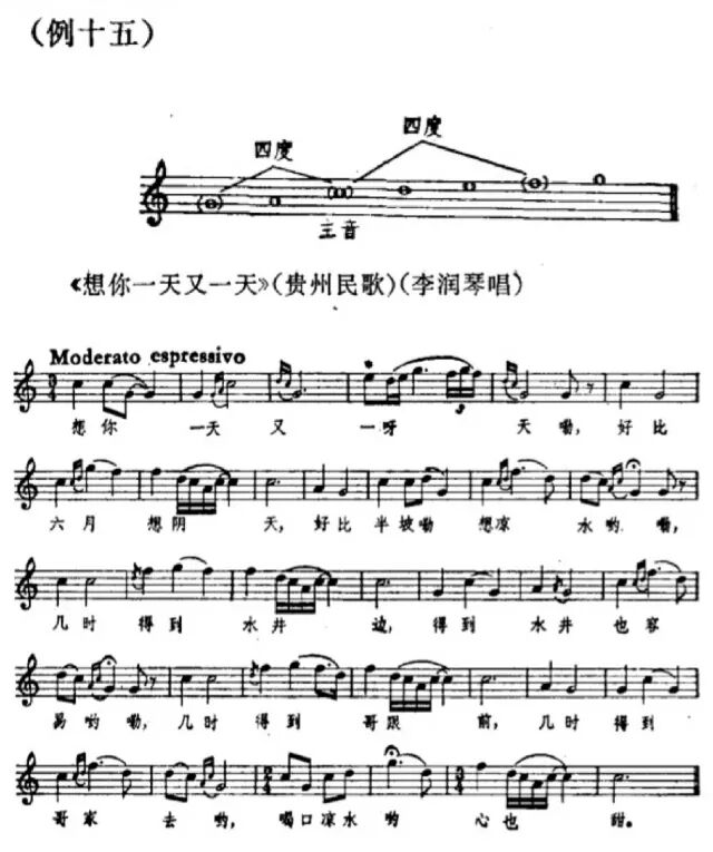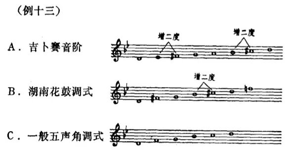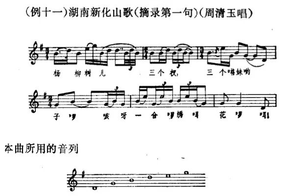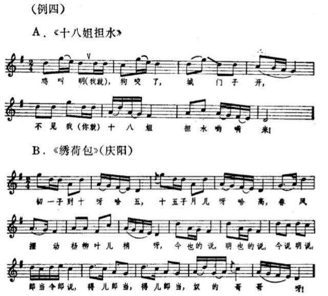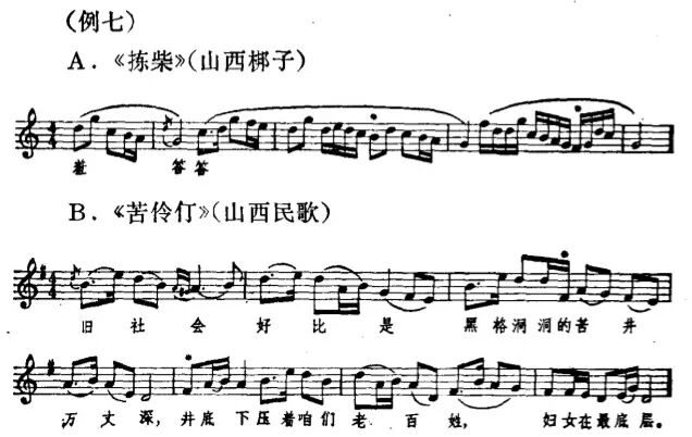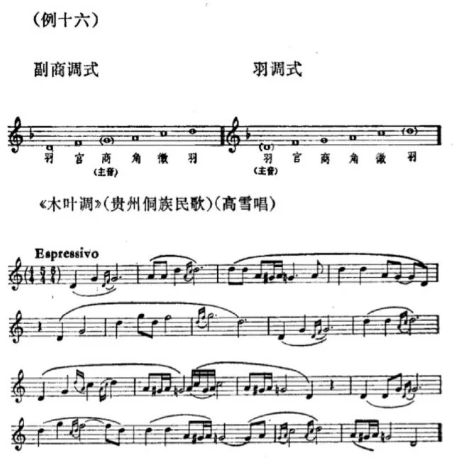 中国音阶及民族调式问题(上) 决定一个民族的音乐风格特点,虽然有多方面的因素,但音阶及其调式(Mode)也是重要的因素之一。欧洲人一谈到中国音乐就必然要谈五声音阶,我国有许多人在谈到音乐创作时,也把五声音阶的各种调式看作是中国民族音乐,特别是汉民族音乐的唯一的典型特征。应该承认,五声音阶在中国有其悠久的历史与深远的影响,但是否即可认为它是汉族一切音阶调式唯一的基础和出发点呢?这就是个问题了。 事实上中国是个多民族的国家,根据中国历史记载以及现存的各方面的音乐资料来看,问题并不那么简单。不但在各兄弟民族中存在着各不相同的特殊民族调式,即使是汉民族所用的调式,也是多种多样的。 据司马迁(约纪元前145-90年)的《史记》中记载,纪元前227年,燕太子丹使荆轲刺秦始皇,送别于易水之上,“高渐离击筑(一种乐器),荆轲和而歌,为变徽之声,士皆垂泪涕泣。又前而为歌曰‘风萧萧兮易水寒,壮士一去兮不复还’!复为羽声慷慨,士皆瞋目,发尽上指冠”。“变徵”相当于C调音阶的升F,“羽”相当于C调的A。可想见,在两千多年以前,就有人运用了五声音阶以外的“变徵之声”,使得“士皆垂泪涕泣”。“变徵之声”在这里发生了这么大的作用,可想见这个非五声以内的音,已经不是作为临时性的装饰音,而成为构成音乐内容的一个重要因素了。纪元前770年已有七声音阶的记载,出现了“变宫”、“变徵”音。这些音的出现,也许是由于五声音阶连续两次向上五度转调的结果。 目前各地民歌及地方戏曲中,五声音阶的运用相当广泛,并且也采用音阶的纯四度、增四度(变徵)、小七度、大七度(变宫)等音,作为从近关系调中借来的音运用,这些音在五声音阶中多少带一些临时性质。但这仅是问题的一方面,不能因此而证明中国不存在完整独立的七声音阶。 在一千多年以前的隋唐时代,从西域传来了龟兹乐,形成所谓“八十四”调,这意思就是说在一个八度中有十二个半音,在它的每一个半音上都可以有七个七声音阶的调式,因而就共有八十四个调式。这不过是一种理论上的推算,实际上并没有用那么多的“调”。当时乐器的构造简单,也不可能演奏出那么多的“调”来。至少从这里得到一个证据,证明那时候从西方传入了一个独立的七声音阶和它的七个不同的调式。运用这些调式所构成的外来音乐,对中国音乐的发展产生过很大的影响。 很可惜,隋、唐时代的音乐,单有文字记载,可靠的乐谱记载没有保留下来。宋朝的诗人兼作曲家姜白石(约1155-约1229)的十七首歌曲,是流传下来的较早的乐谱记载之一。从它的今译谱中可以看出,很明显地运用了七声调式,其中每一个音都发挥了独立的作用,不可能用所谓“五声音阶的扩展”的说法来加以解释的。 从各地现有的民歌及地方戏曲中也可以看出,有许多都不可能用一般的五声音阶的五种调式来解释,也不可能用五声音阶的扩展法来解释。下面我想举出一些具体的实例来说明。 陕西北部民歌与当地的地方戏曲郿鄂调有它突出的特殊风格,这种风格的特点具体地表现在它的调式结构形式上。下面试将一般五声徵调式与陕北民间调式作个比较: 可以看出,这是一个六声音阶,假如说它是个徵调式的话,它与五声音阶的徵调式完全不同,它缺少五声徵调式中的B音(角音)。这个音即或出现,也仅仅是作为装饰音,例如下面第四例A.的第四小节中作为经过音的B音。同时它又具有五声徵调所没有的变宫音升F与清角音C音。也可以说这是个商调式,升F作为商调式的“变徵音”,但这又是一个五声以外的音。事实上,这两个音是这个调式中最具特色的音,也可以说陕北民歌与郿鄂调的特色具体地表现在这两个音的运用上,不单是象第四例B.的9、10两小节的升F,与12、15两小节的C音可以作为乐思暂时停顿的音,而且在同例第七小节中出现了从升F到C的减五度音程的进行。也许有人不承认有这么个调式存在,而认为不过是个综合性的调式,即是说象例五中的升F与C是从相邻的近关系的宫调中借来的,因之这些音是游移不定的,凡属出现这些音的地方都勉强解释成为装饰音,或是从宫音下滑的音,总之,它们都是不重要的音。我认为这种论点是单纯从五声音阶的框框出发,机械地去解释所有独具特点的一切民间调式,因而脱离了民间音乐的具体实际,把问题弄得愈来愈玄妙莫测。我们研究陕北民歌的这种调式,必须从许多同类民歌及相同风格的郿鄂调中去发现它的曲调进行的一般规律,不能用一个五声音阶的现成的框框去套它,更不能截取个别小节中的音,去勉强解释说它是属于这个调或那个调。这样不但不能解决问题,反而离开问题的本质愈来愈远,而走入迷途。象例(五)陕北调式中升F,实际音往往比升F音稍微低一点,但不能说它是一个游移的不重要的音,更不能说象下例B.9、10两小节中的升F音是从宫音G滑下来的音;恰恰相反,在这里升F与C音是陕北调子的特性音,缺少了这两个音就一定失去陕北调子风格的特点,同时陕北徵调式中,缺少调式的大六度音(角音),这正是它有别于其他调式的特点。如果“角”音经常在重要的地方出现,马上就会失去陕北调子风格的特性,这些特征是熟悉陕北音乐的人所共知的。 陕北调式,有时也出现宫调式的形式,如下例《三十里铺》是C宫调式,全曲中“角”音E没有出现而出现“清角”音F。象第